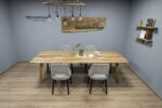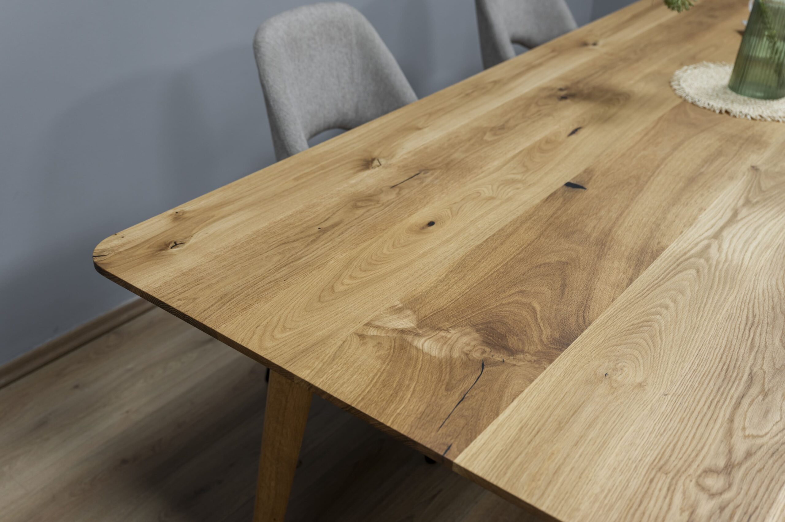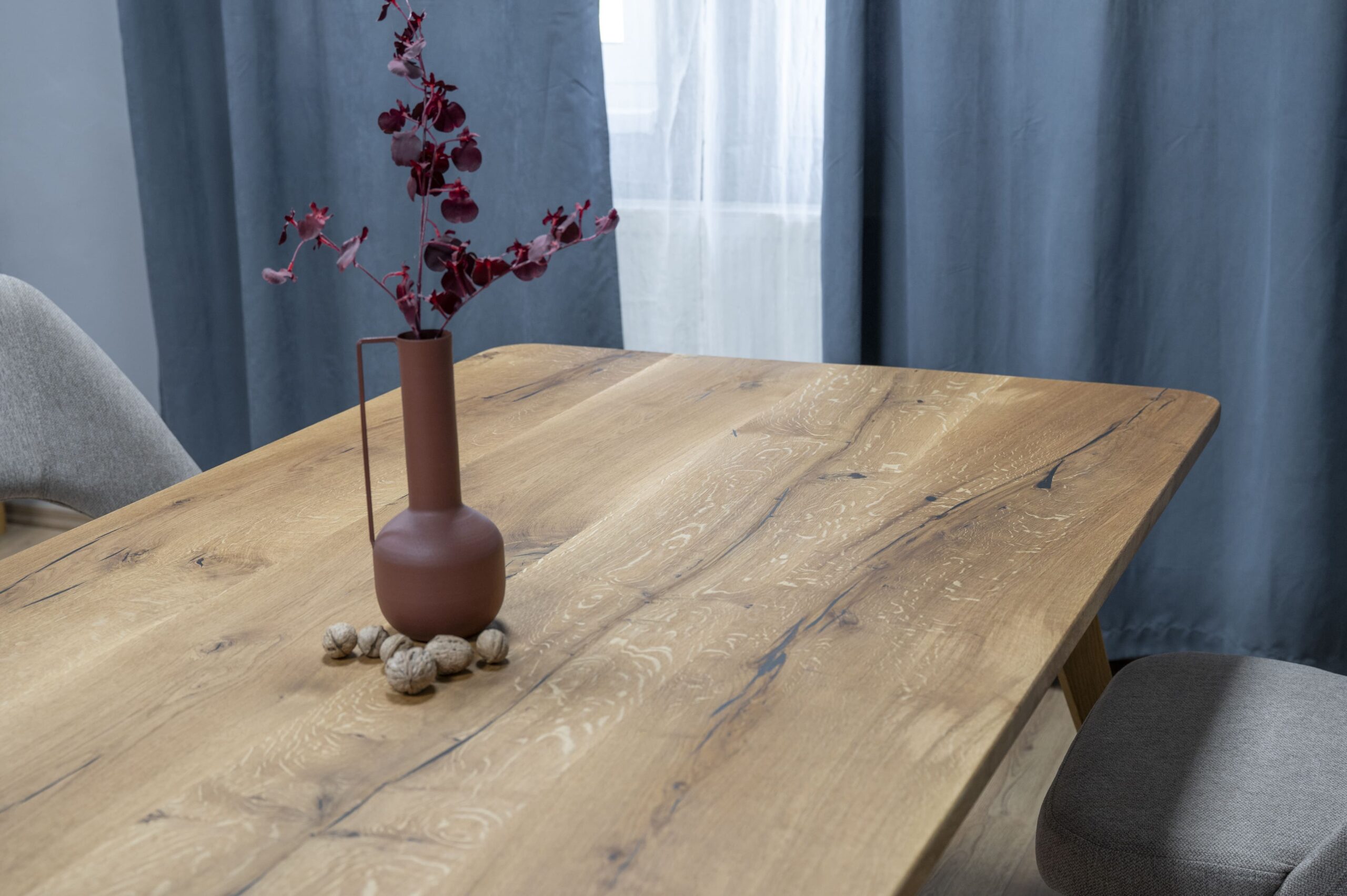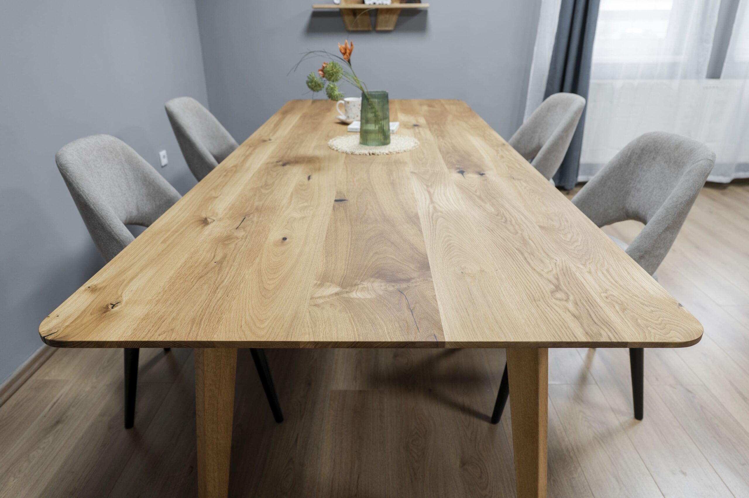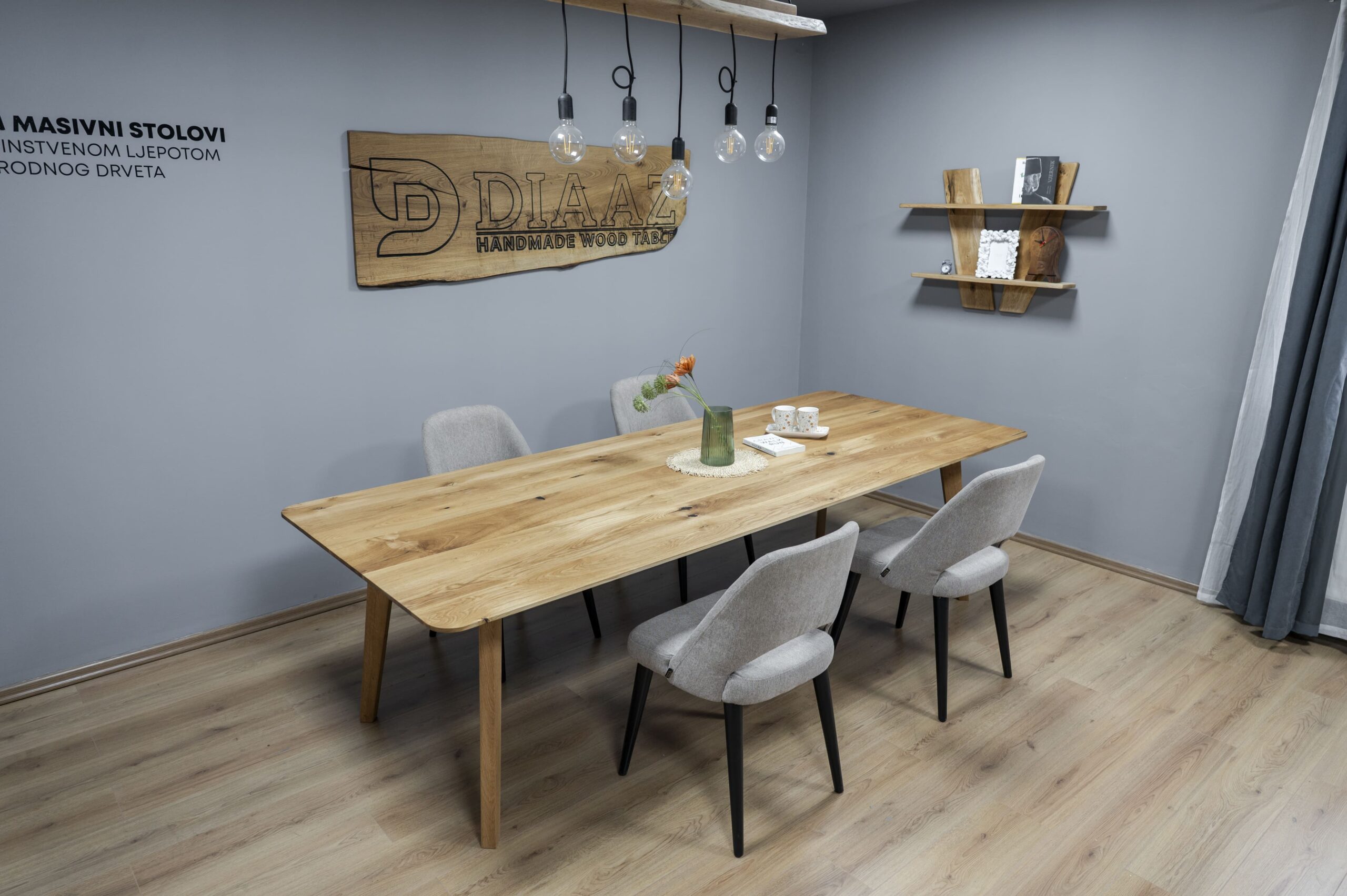 Sve stolove izrađujemo ručno od punog drveta. Trudimo se da ploče drveta pripremimo za izradu finalnog proizvoda birajući komade koji su, prije svega, kvalitetno osušeni. Potom biramo najljepše komade stabla koje čini čisto drvo prirodnog dizajna. Ploče obrađujemo njegujući godove i prirodnu teksturu drveta, sa ciljem da istaknemo upravo te najljepše dijelove iz stabla. Takav pristup, uz ručni rad, naše stolove čini unikatnim i posebnim. Stolove ne farbamo, već kao završni sloj koristimo samo ulje Rubio.